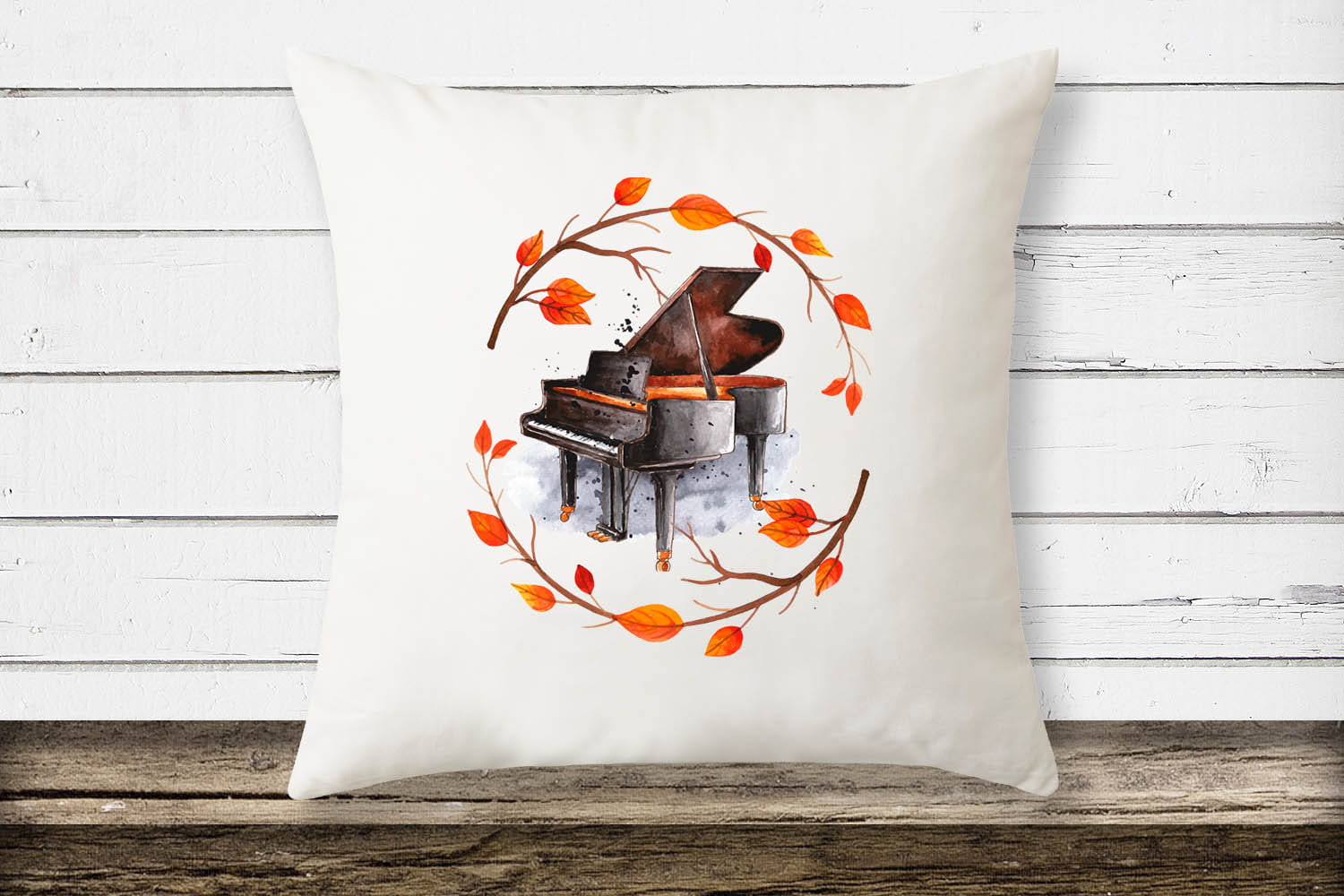 Biała poduszka z miękkiej mikrofibry, fortepian z motywem jesieni.