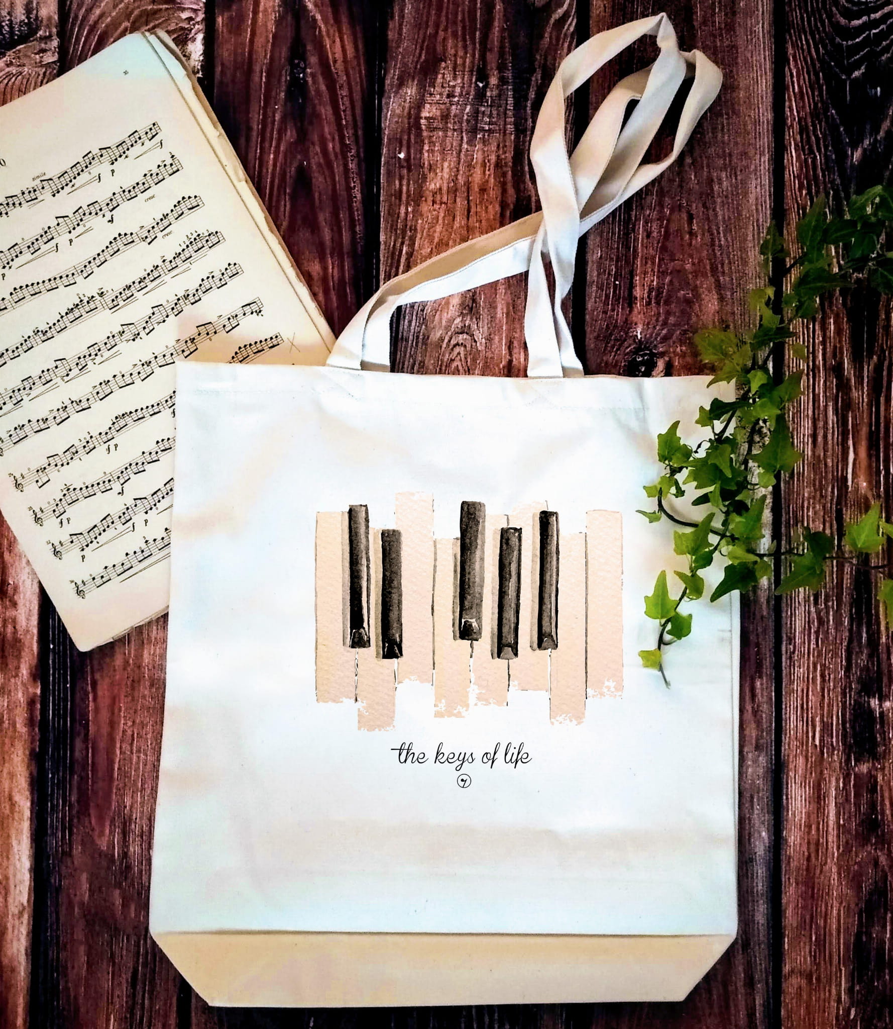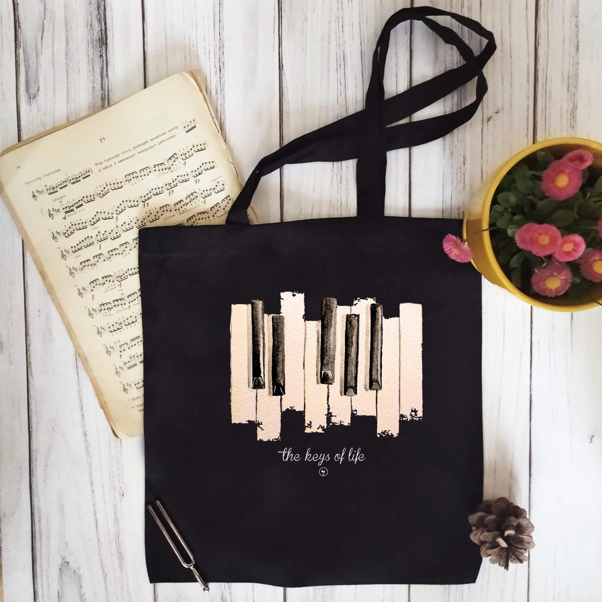 Torba na nuty inne muzyczne szpargały. Może się przydać również na zakupy czy też ciężką teczkę z racji na mocny materiał (to znacznie mocniejsza torba, niż zwykle są sprzedawane). Torba z fortepianem.