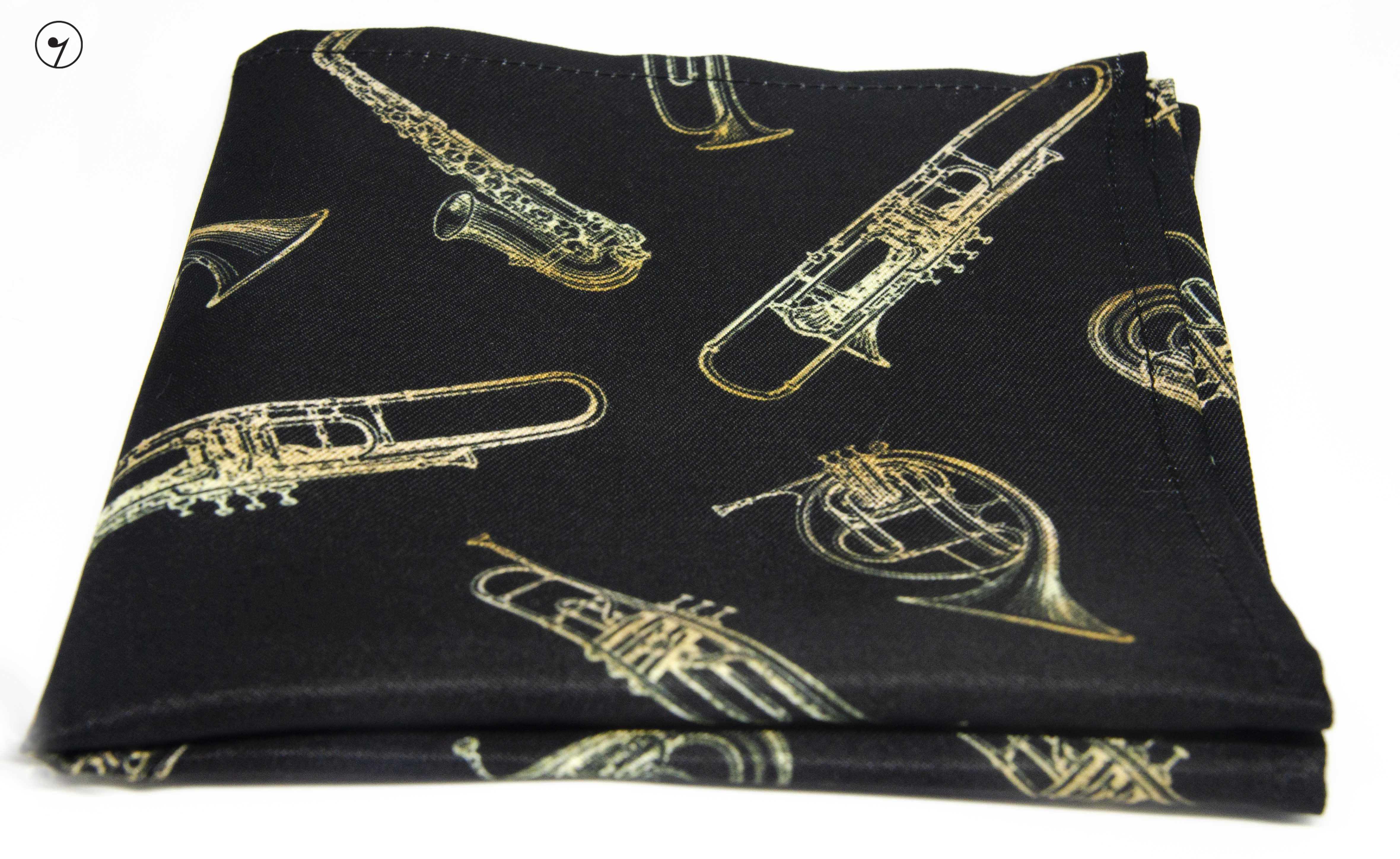 Poszetka - Czarna w złote instrumenty - Saksofon, Waltornia, Trąbka