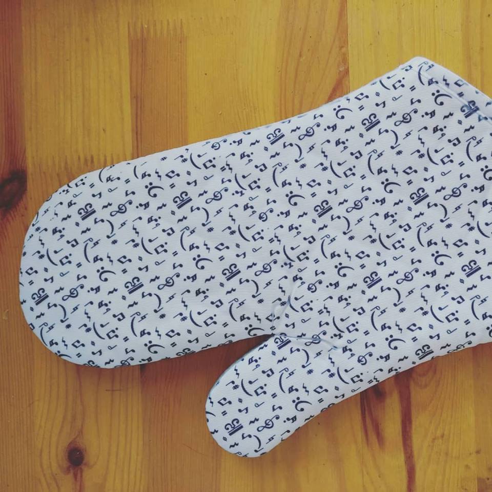 Rękawica kuchenna z nutami. Z racji na wykonywanie jej ręcznie, ułożenie muzycznych motywów może różnić się nieznacznie od siebie.