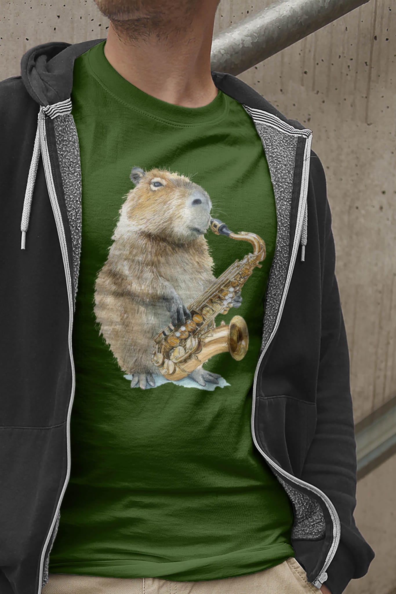 Szukasz prezentu dla saksofonisty, który nie jest nudny i wygląda dobrze? Ta koszulka to fajny prezent dla muzyka ale także, bardzo trafiony prezent dla saksofonistki. Na grafice kapibara gra na saksofonie, więc motyw jest jasny od razu: saksofon i muzyczny klimat.