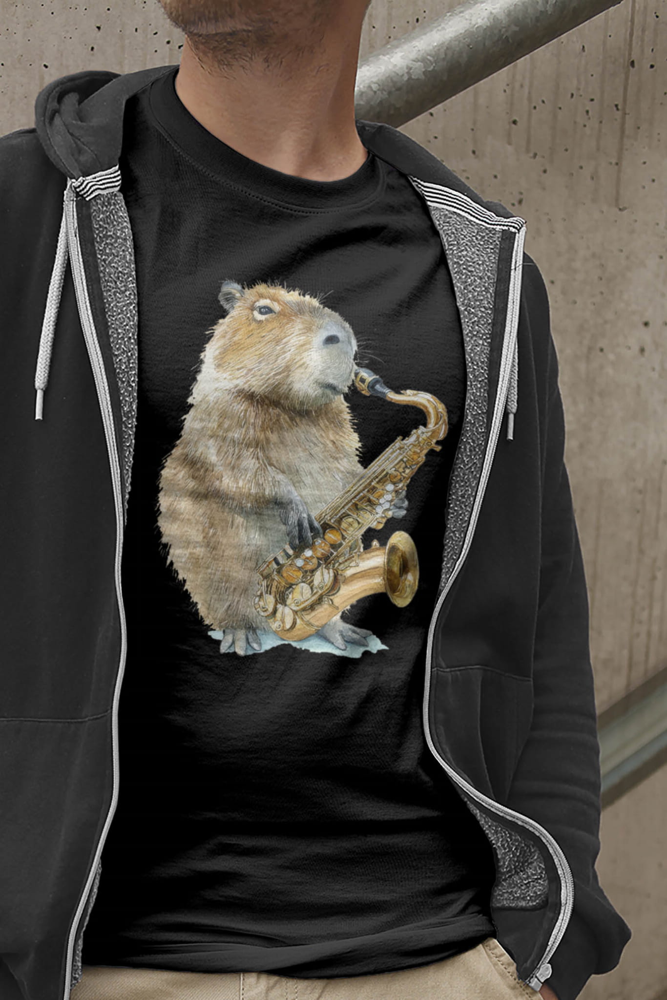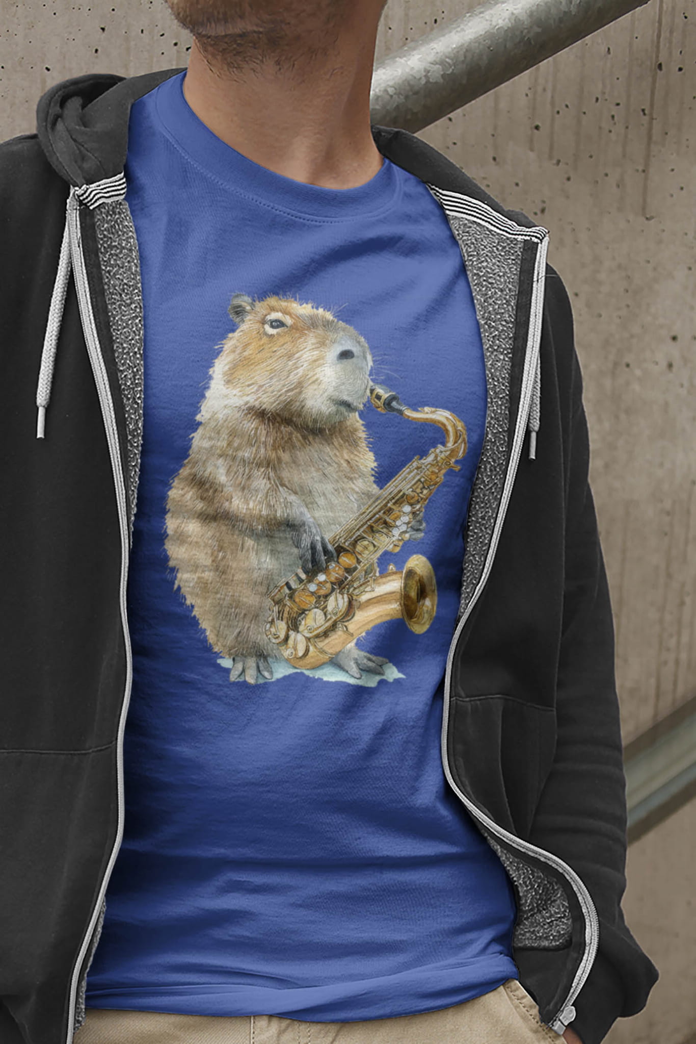 Kapibara z saksofonem, w trakcie grania. Prosty, zabawny motyw dla osób, które kochają saksofon i mają dystans do siebie i muzyki.