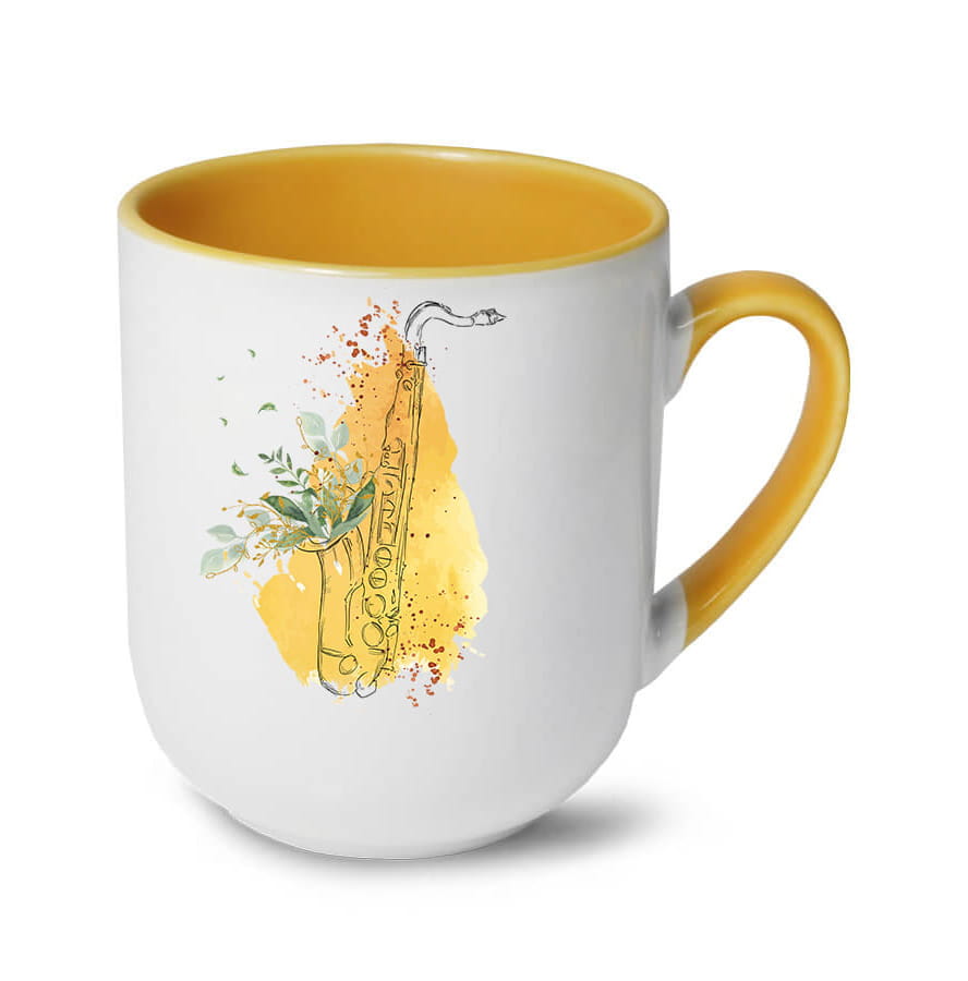 Kubek biały błyszczący, uchwyt i środek żołty. Nadruk - saksofon liście.