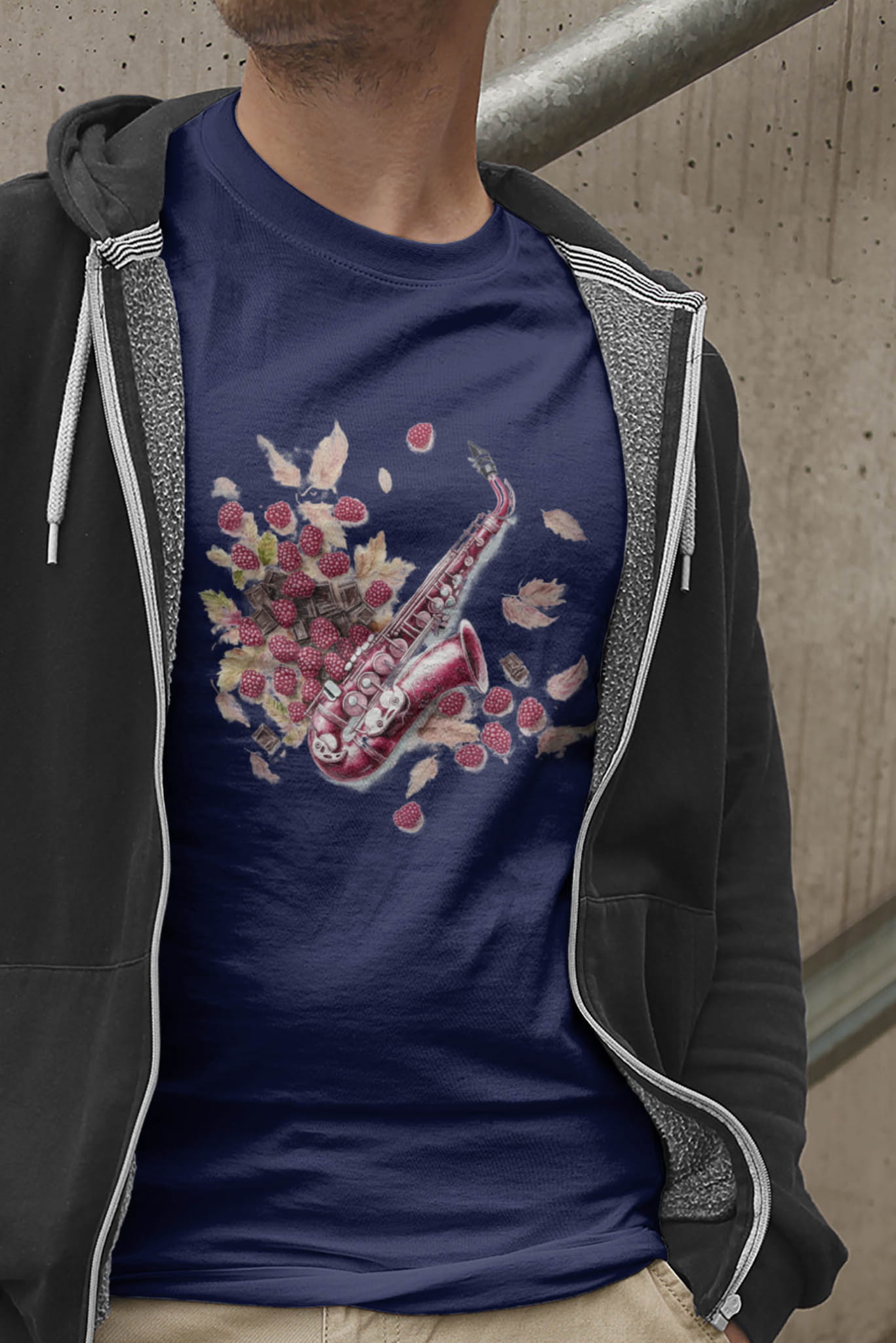 - Wyjątkowy design i artystyczny wyraz: Grafika „Saksofon w malinach”, autorstwa Pauliny Strejczek-Jaźwińskiej, przyciąga uwagę i wnosi nutkę muzycznej pasji do codziennego stroju. To wzór, który z pewnością wyróżni każdego muzyka na tle otoczenia, dodając stylu i oryginalności.