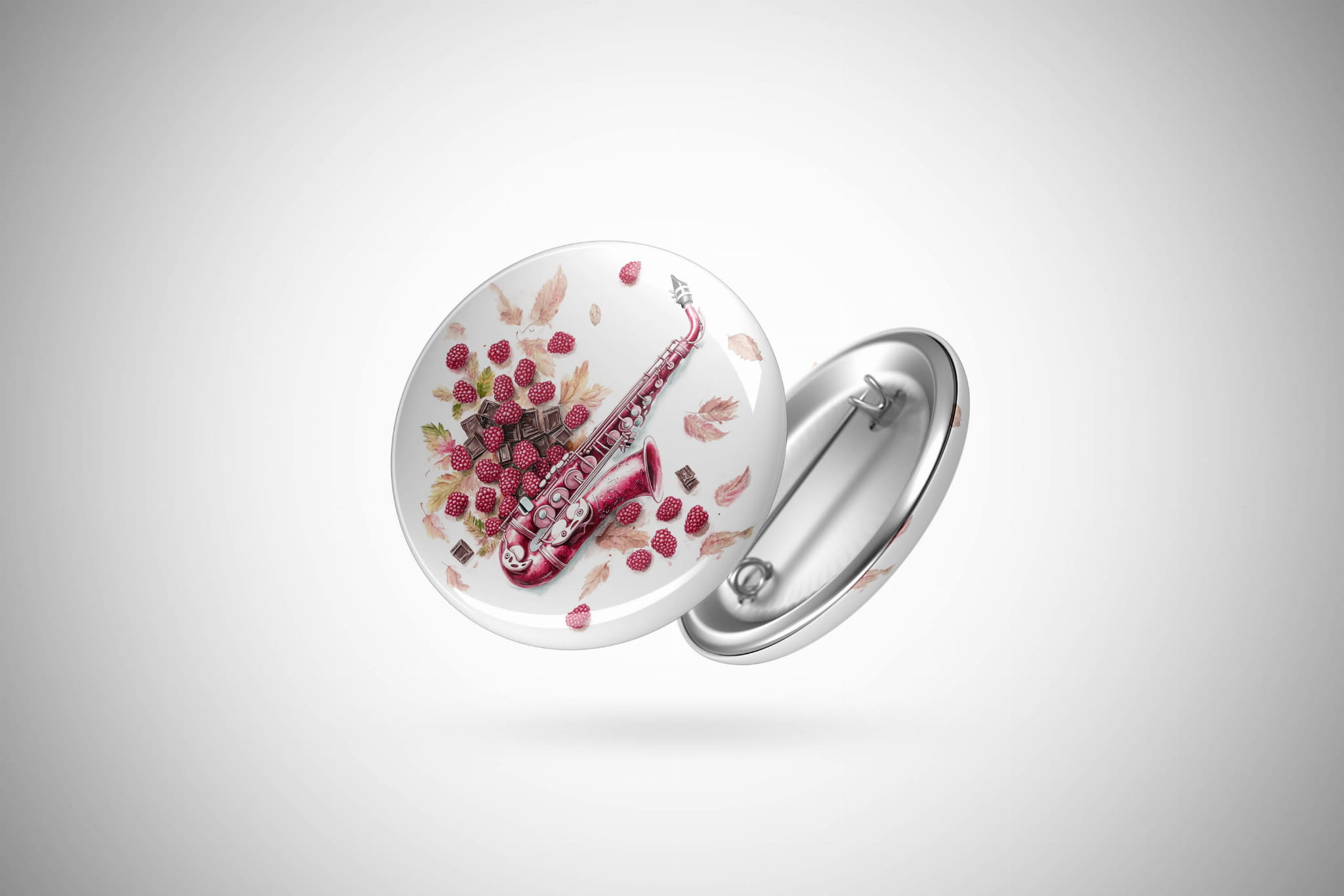 Przypinka z motywem „Saksofon w malinach” – idealny drobiazg dla miłośników muzyki!