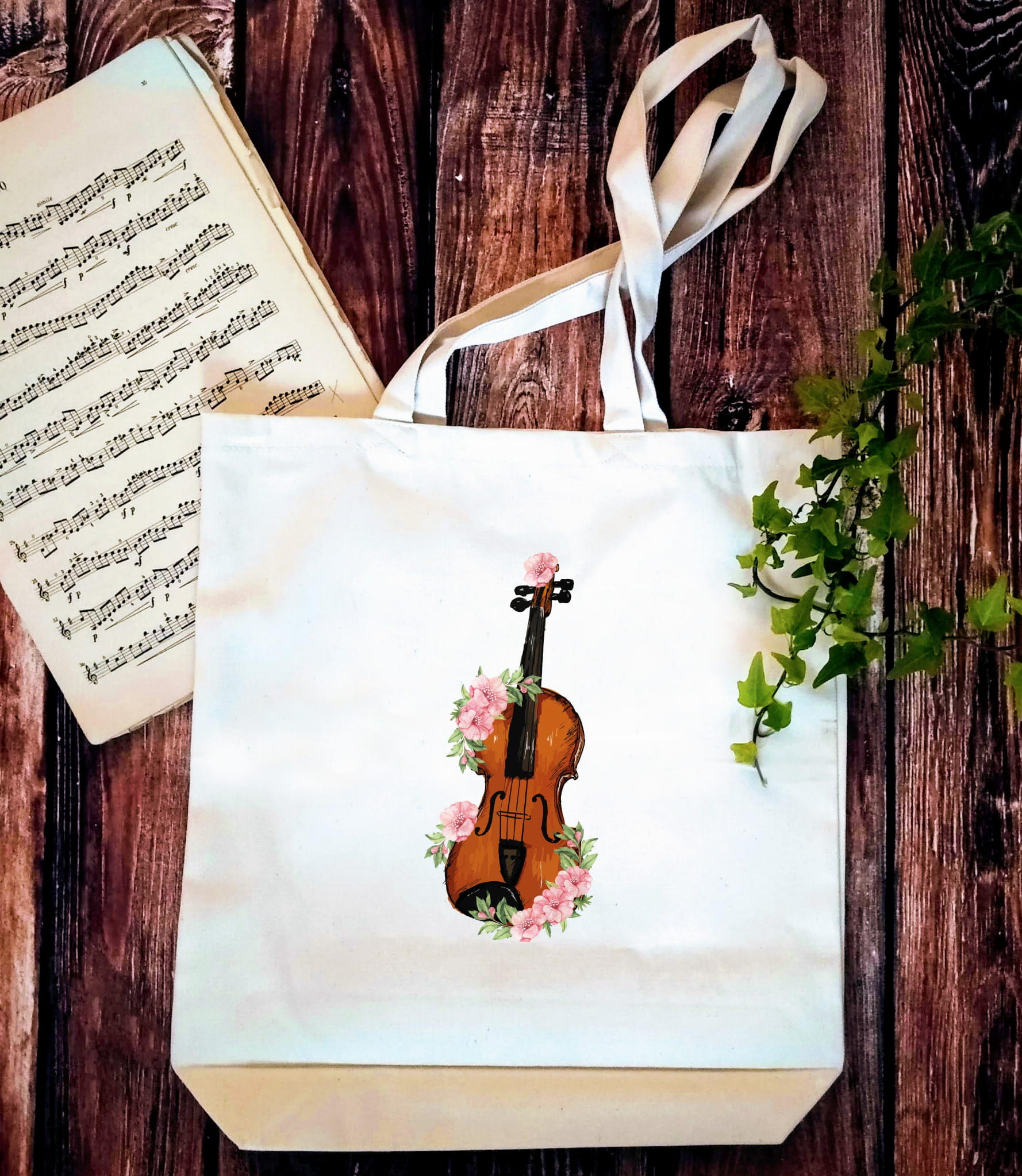 Torba na nuty i inne muzyczne szpargały ze skrzypcami. Może się przydać również na zakupy czy też ciężką teczkę z racji na mocny materiał (to znacznie mocniejsza torba, niż zwykle są sprzedawane). Skrzypce - kwiaty.