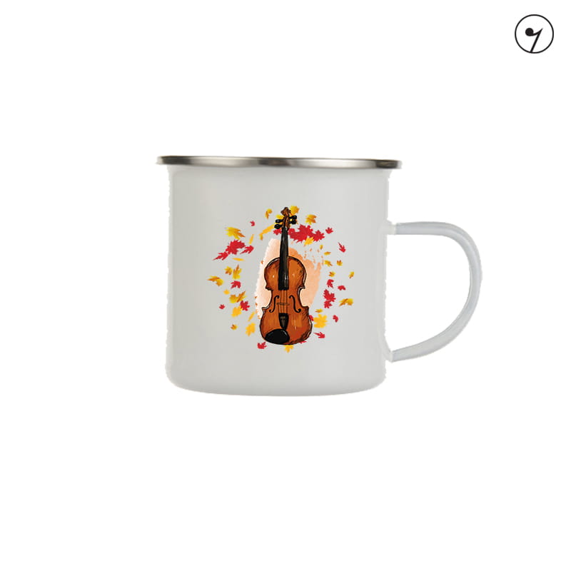 Kubek metalowy, emaliowany z uszkiem. Wzór: Skrzypce - Liście.