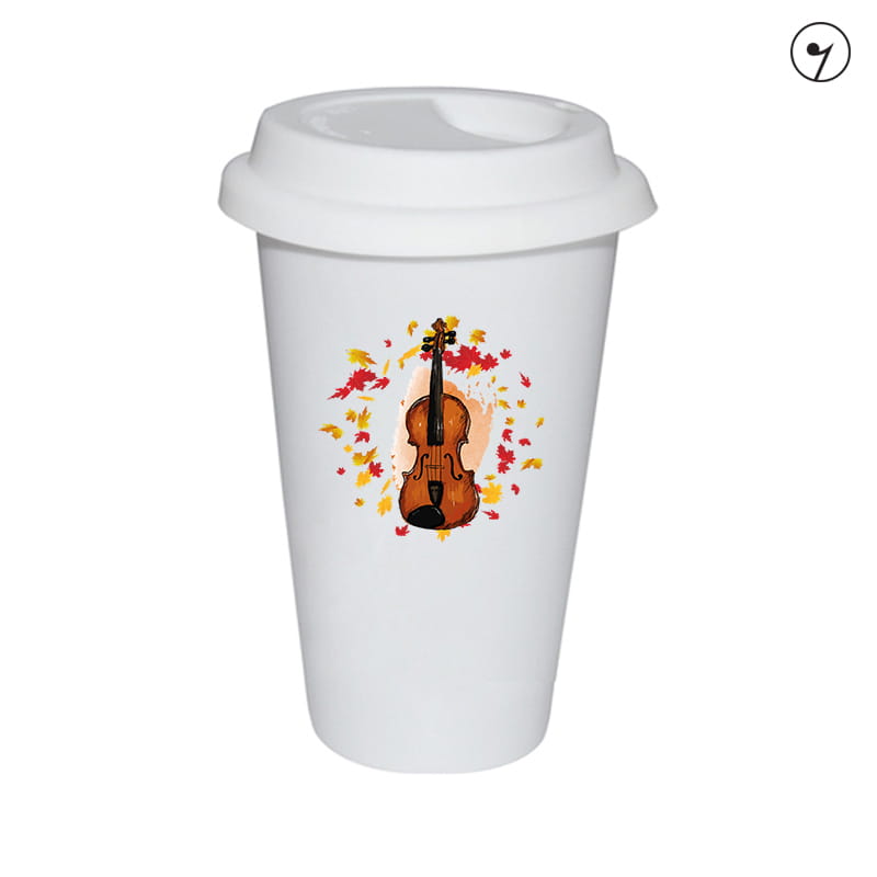 Kubki typu tumbler posiadają podwójną ściankę zapewniającą doskonałą izolację termiczną napojów, zarówno gorących jak i zimnych. Kubek wyposażony jest w wieczko zapobiegające rozlewaniu się napoju np. w samochodzie. Wzór: Skrzypce - Liście.