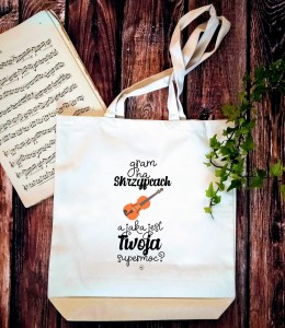 Torba na nuty i inne muzyczne szpargały. Może się przydać również na zakupy czy też ciężką teczkę z racji na mocny materiał (to znacznie mocniejsza torba, niż zwykle są sprzedawane). Ze skrzypcami.