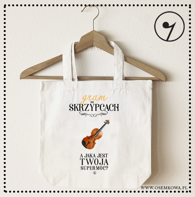 Torba na nuty i inne muzyczne szpargały. Może się przydać również na zakupy czy też ciężką teczkę z racji na mocny materiał (to znacznie mocniejsza torba, niż zwykle są sprzedawane). Ze skrzypcami.