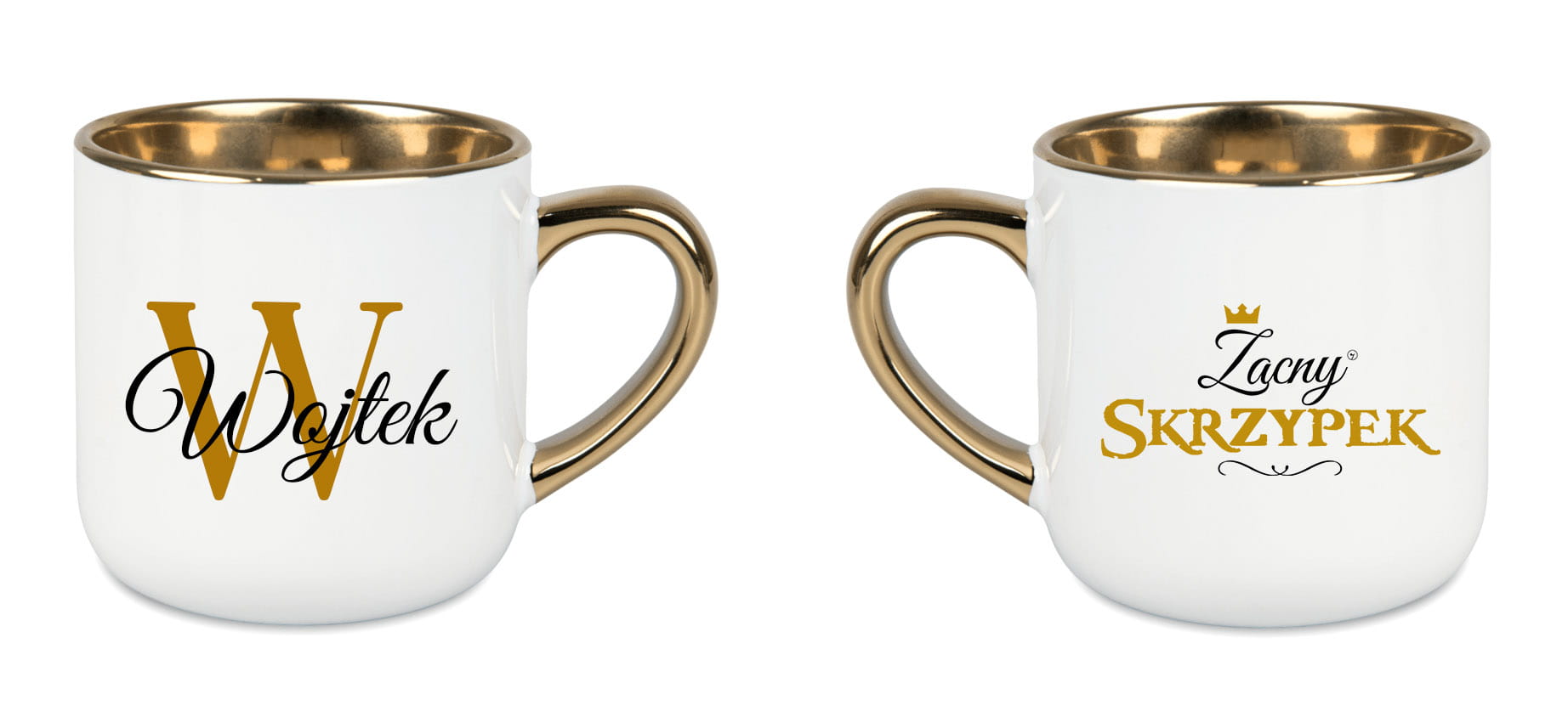 To biały, ceramiczny, elegancki kubek o pojemności 400 ml, ze złotym rantem i uchwytem, dostępny z napisem „Zacna skrzypaczka” lub „Zacny skrzypek” oraz możliwością personalizacji imieniem. Można go dodatkowo zamówić w ozdobnym opakowaniu z kokardą.