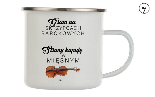 Kubek metalowy, emaliowany z uszkiem, Skrzypce barokowe - Struny kupuję w mięsnym - Kubek metalowy emaliowany