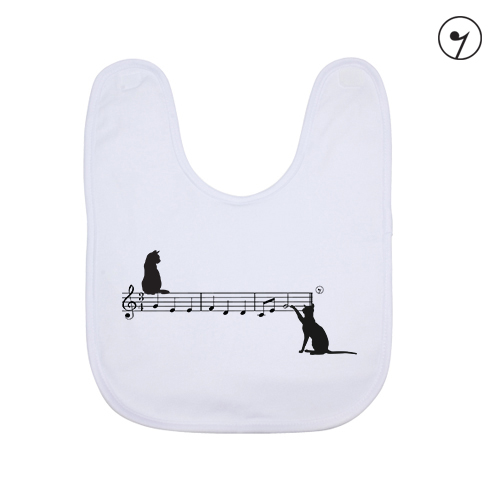 Biały śliniak frotte dziecięcy wykończony białą lamówką z nutkami i instrumentami.