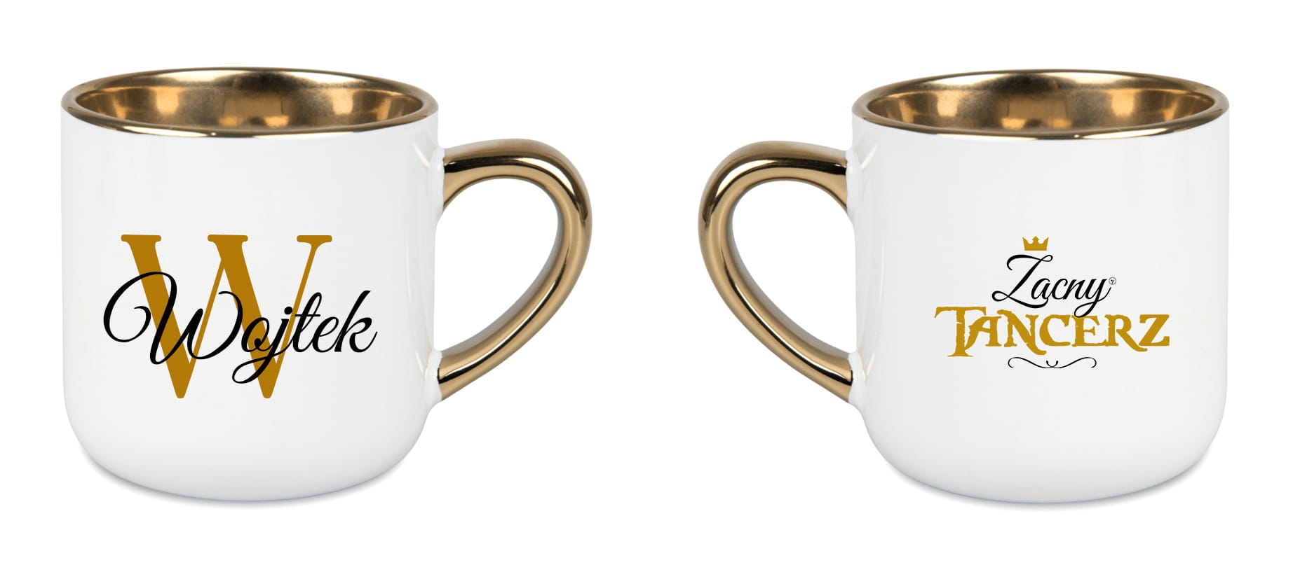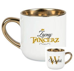 To biały, ceramiczny, elegancki kubek o pojemności 400 ml, ze złotym rantem i uchwytem, dostępny z napisem „Zacna tancerka” lub „Zacny tancerz” oraz możliwością personalizacji imieniem. Można go dodatkowo zamówić w ozdobnym opakowaniu z kokardą.