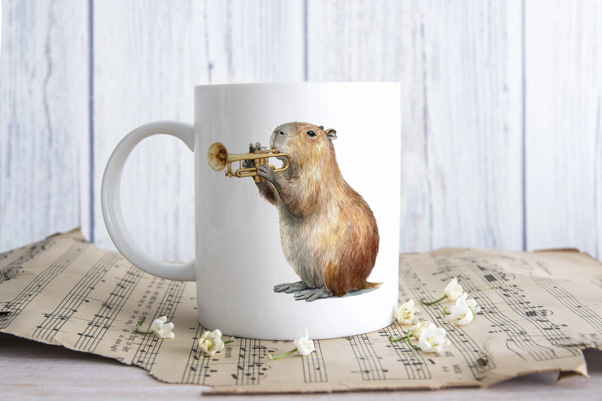Kubek dla muzyka na kawę. Kapibara gra na trąbce.