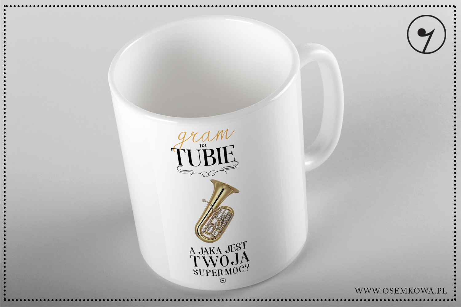 Biały. Nadruk sublimacyjny. Lubi mycie ręczne :)