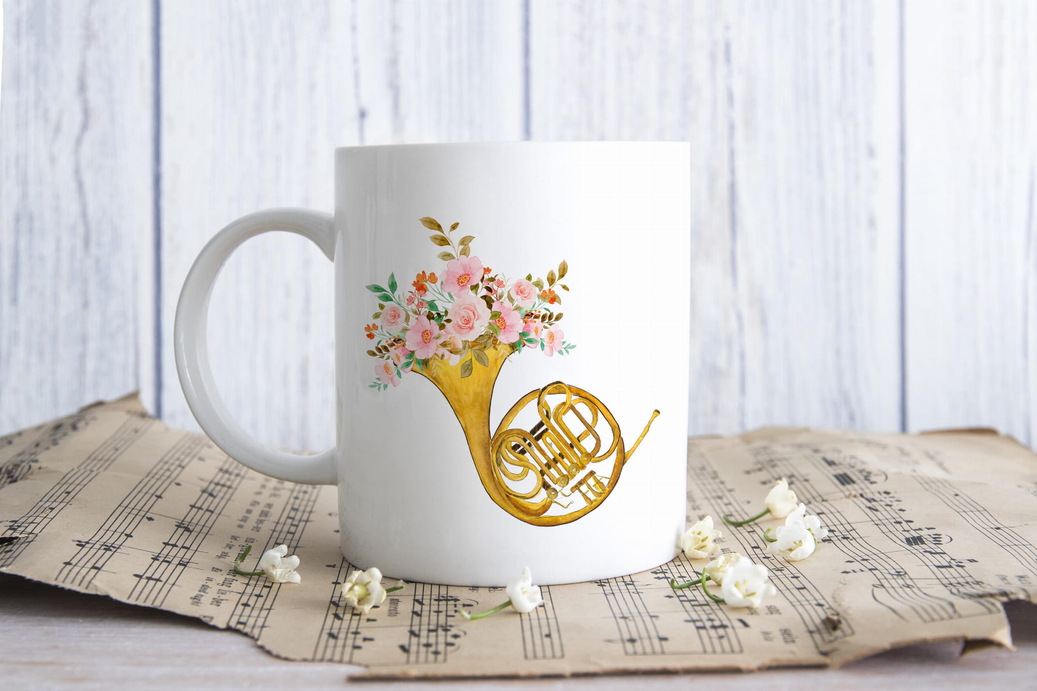 Kubek muzyczny, który jest super prezentem dla każdego muzyka. Waltornia - Kwiaty - Kubek ceramiczny