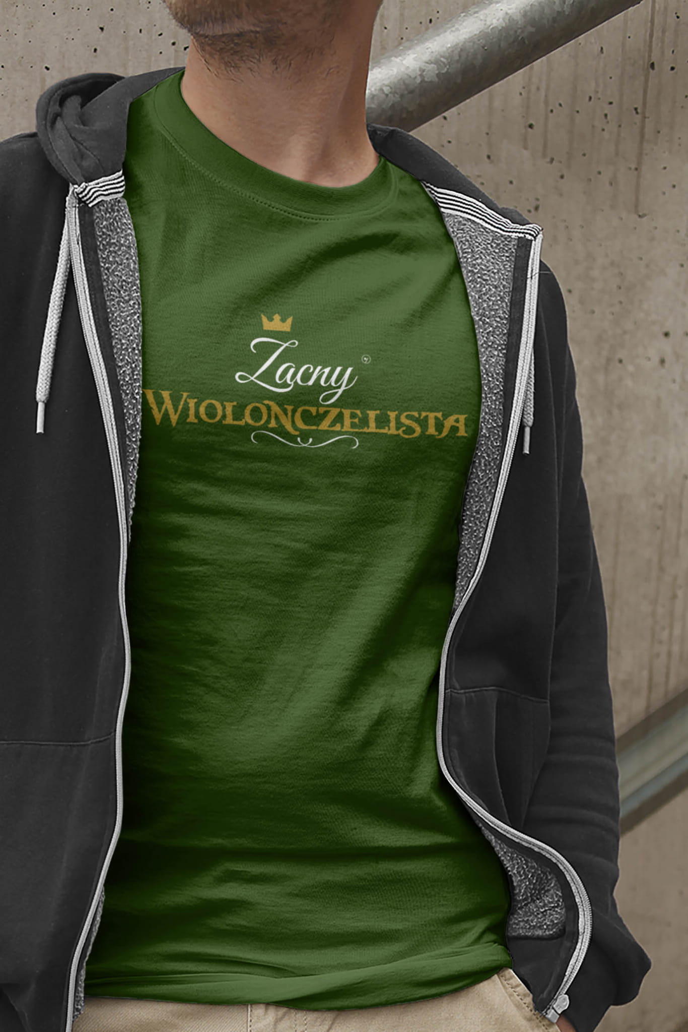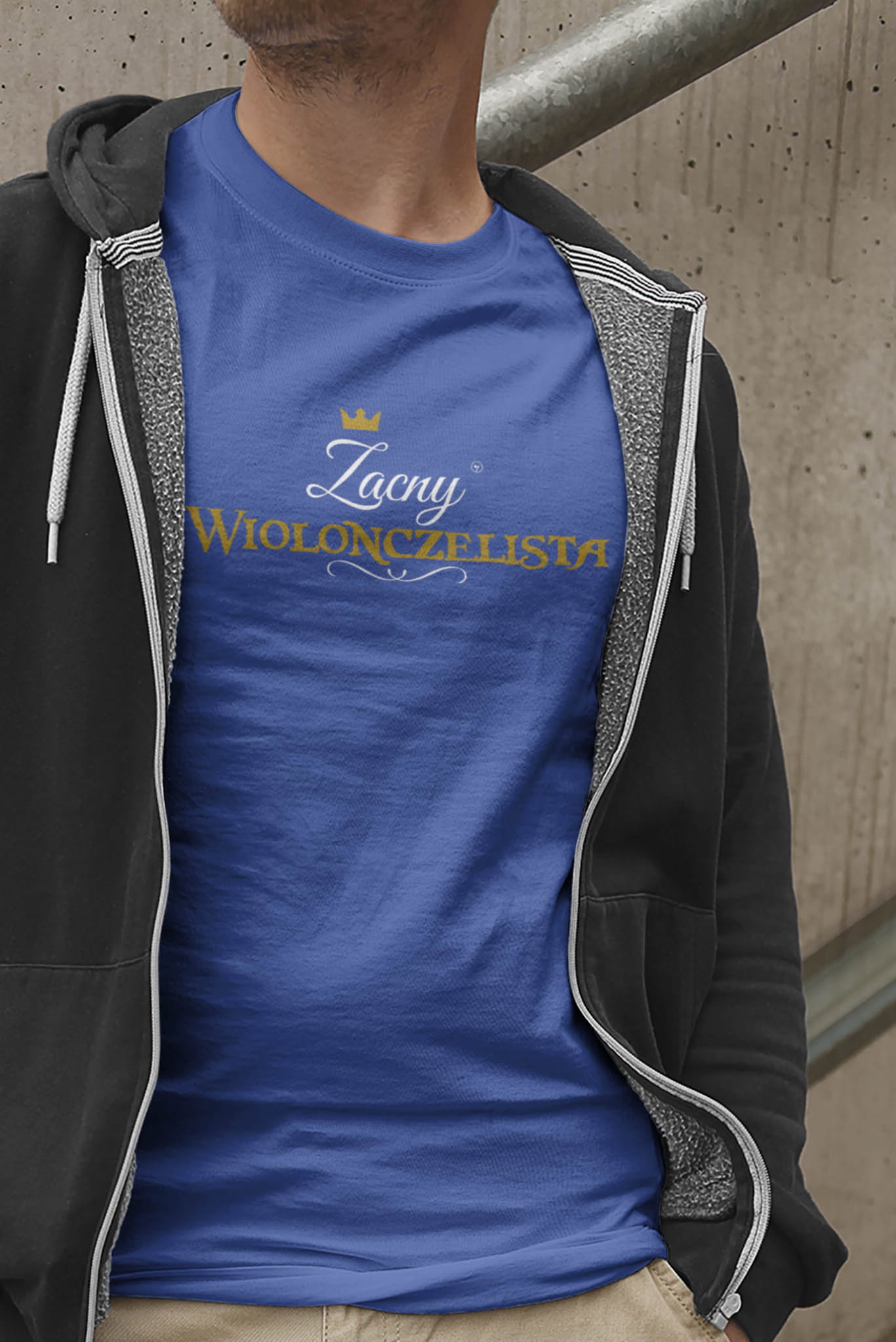 Koszulka „Zacny wiolonczelista / Zacna wiolonczelistka” ma z przodu ozdobny napis ze złotą koroną i czarnym ornamentem. Wygląda elegancko i ma charakter, bez przesady i bez tanich żartów. Wybierasz wersję napisu: „Zacny wiolonczelista” lub „Zacna wiolonczelistka” i masz gotowy upominek dla wiolonczelisty, który będzie noszony. Wzór jest autorstwa Pauliny Strejczek-Jaźwińskiej.