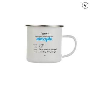 Kubek metalowy, emaliowany z uszkiem, ze wzorem - "Zaśpiewaliście nierówno ale za to nieczysto"